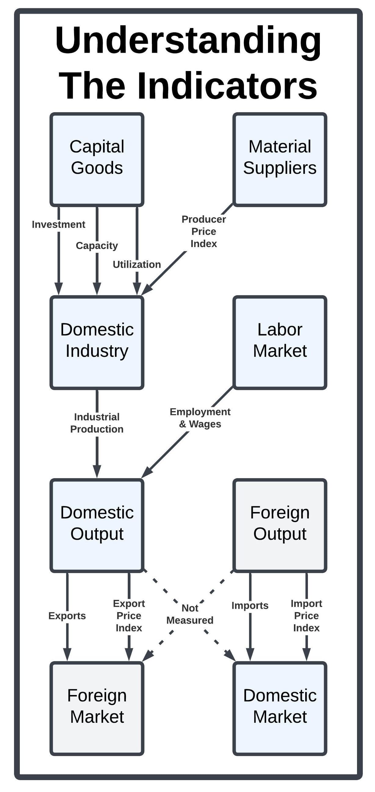 - Industrial Production measures real physical output across manufacturing, mining, and utilities